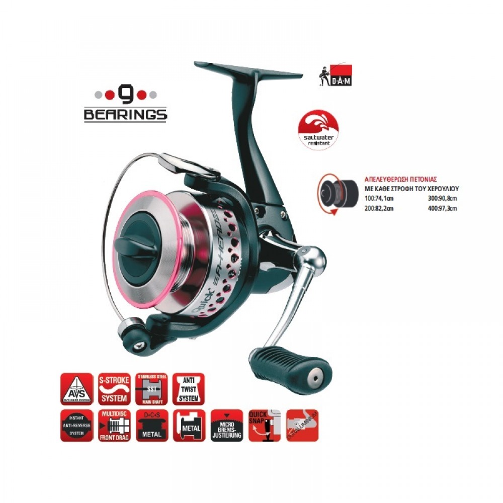 Λέγοντας ότι τα QUICK® A-Head δεν είναι απλά ένα όνομα, αλλά μια φιλοσοφία, η D.A.M. έφερε μια νέα ιδέα στο μακρινό πέταγμα για μια μεγάλη γκάμα χρηστών. Αυτό συμπεριλαμβάνει πολλά είδη spinning, αλλά επίσης και feeder. Το “κόλπο” είναι μια μπομπίνα αρκετά χαμηλού προφίλ με μια εξαιρετικά μεγάλη διάμετρο. Αυτό μειώνει δραματικά την τριβή και το πέταγμα γίνεται μια εντελώς νέα εμπειρία σε σύγκριση με τα “συνηθισμένα” μηχανάκια. Εκτός από αυτό η χαμηλή μπομπίνα επιτρέπει να δημιουργηθεί ένα εξαιρετικά κοντό και συμπαγές σώμα που μαζί με το μεγάλο “κεφάλι” δίνει στο μηχανάκι ένα ξεχωριστό και μοναδικό σχεδιασμό που συμπληρώνεται από έναν μοντέρνο και ελκυστικό χρωματικό συνδυασμό. Σώμα, μπομπίνα και χερούλι από υψηλής ποιότητας αλουμίνιο δίνουν στο μηχανάκι σταθερότητα ενώ ο ρότορας από γραφίτη μειώνει το βάρος και διευκολύνει την περιστροφή. 8 εξαιρετικά ανοξείδωτα ρουλεμάν και 1 αντεπιστροφής διασφαλίζουν ομαλή λειτουργία, τέλειο και μακρινό πέταγμα. Ένα μοναδικό μπροστινό φρένο με μικρορυθμίσεις επιτρέπει να το χρησιμοποιείτε ακόμα και με τις λεπτότερες πετονιές.